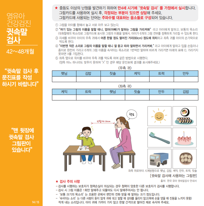 - 6차(생후42~48개월)검진시 귓속말검사를 실시 후 문진표를 작성하시기 바랍니다.