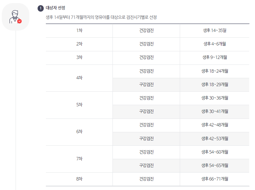 생후 14일부터 71개월까지의 영유아를 대상으로 검진시기별로 선정됩니다. 1차부터 8차까지 이루어지며 생후 14일에서 71개월까지 검진 대상자 입니다.