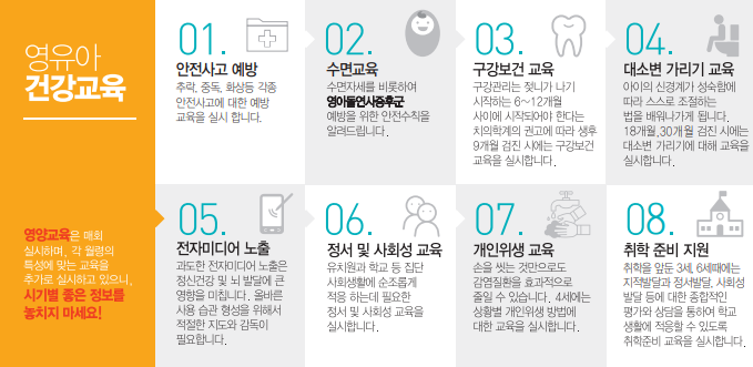 건강교육 안전사고예방, 영양, 영아돌연사증후군 예방, 구강, 대소변 가리기, 전자미디어노출, 정서 및 사회성, 개인위생, 취학전 준비, 수면