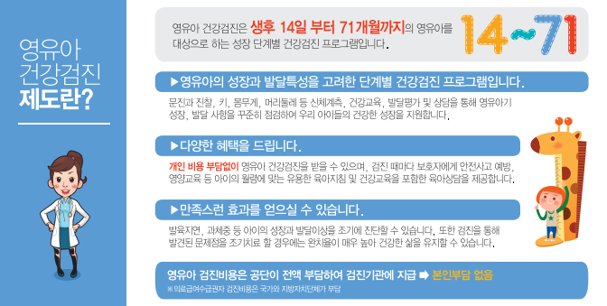 영아와 어린이의 건강 상태를 평가하고, 발달 지표를 확인하여 이상이 있는 경우 조기에 발견하고 치료하고 예방할 수 있는 것을 목적으로 합니다.